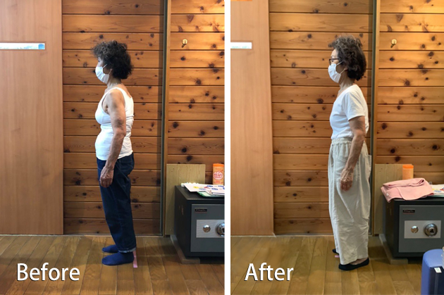 65歳頃から姿勢が気になってきたそうで、かかりつけ医からは、筋肉をつけるため運動を勧められ、プールに通うなど努力しておられましたが、改善には至りませんでした。 遠方にお住まいだったため、娘様の家に滞在し2週間ほど集中的に通っていただいたのですが、1回目から効果を感じていただけました。